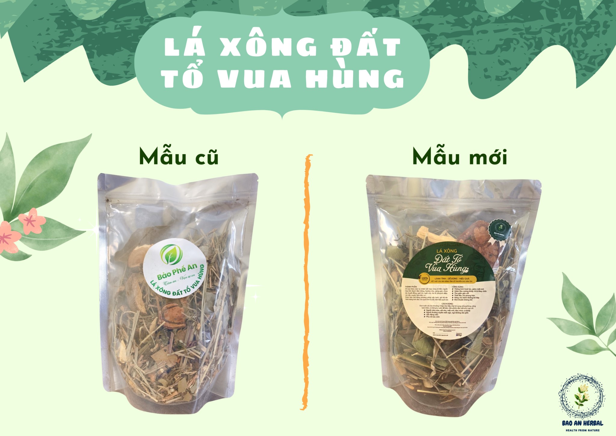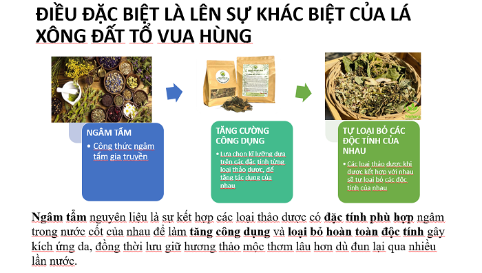 “LÁ XÔNG ĐẤT TỔ VUA HÙNG” là sự kết hợp độc đáo, đặc biệt giữa 35 loại thảo mộc tự nhiên cùng lá tắm người Dao Đỏ: lá tre, cỏ mần trầu, bạch đàn trắng, cỏ xước, kinh giới, sài đất, long nào, hương nhu, lá khế, vòi voi, gừng gió, chùa dù, sả, lá gừng gió, ô rô, duối gai, xấu hổ đỏ, cỏ máu gỗ đỏ, quế chi, trà xanh, lá và vỏ bưởi, ngải cứu, tía tô, khuynh diệp, cúc tần, xuyên tâm liên…vvv. Được bào chế bằng phương pháp sấy lạnh, để giữ tối đa hàm lượng tinh dầu cho hiệu quả trị liệu cao nhất.